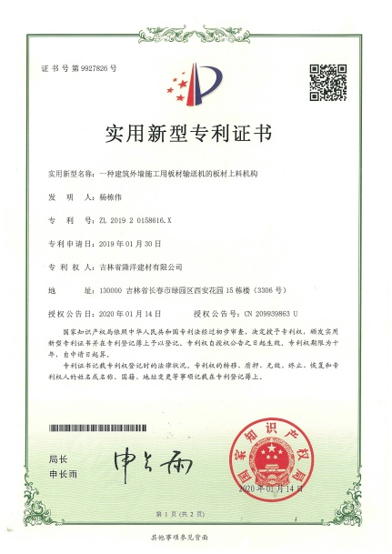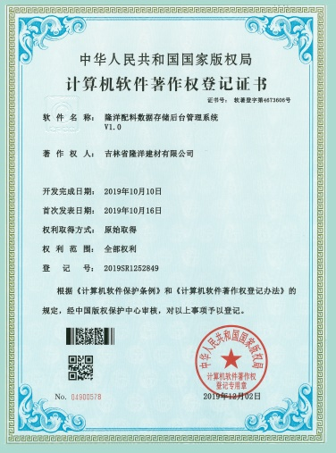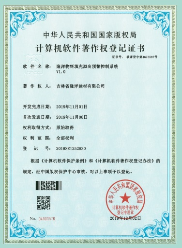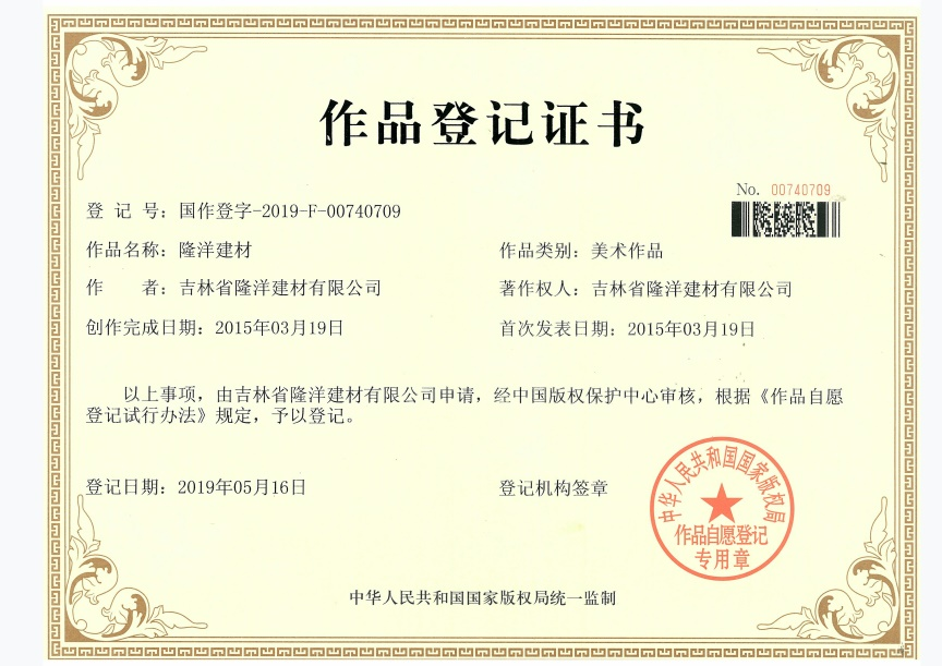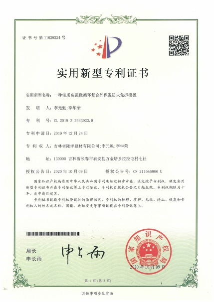 是吉林省隆洋建材有限公司生態(tài)安全與科技創(chuàng)新 “發(fā)明專利”;發(fā)明專利號:ZL 2019 2 0158616.X。