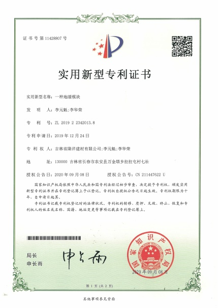是吉林省隆洋建材有限公司生態(tài)安全與科技創(chuàng)新 “發(fā)明專利”;發(fā)明專利號:ZL 2019 2 2343923.8。