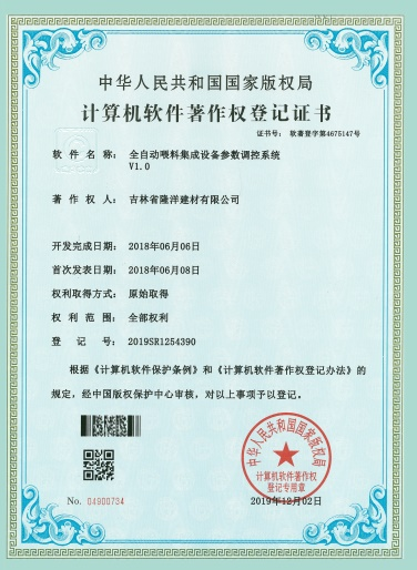 自2017年~2019年隆洋公司連續(xù)三年【榮獲裝配式墻板全自動化生產(chǎn)計算機軟件九項著作權(quán):證書號;第4673615號;第4674524號;第4673596號;第4673587號;第4673606號;第4675147號;第4673380號;第4674455號;第4673635號;】,