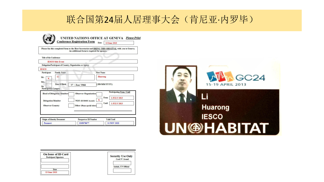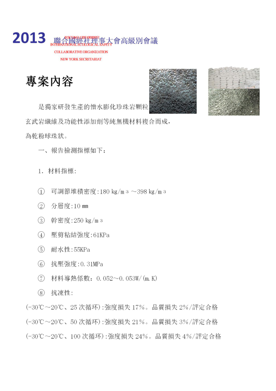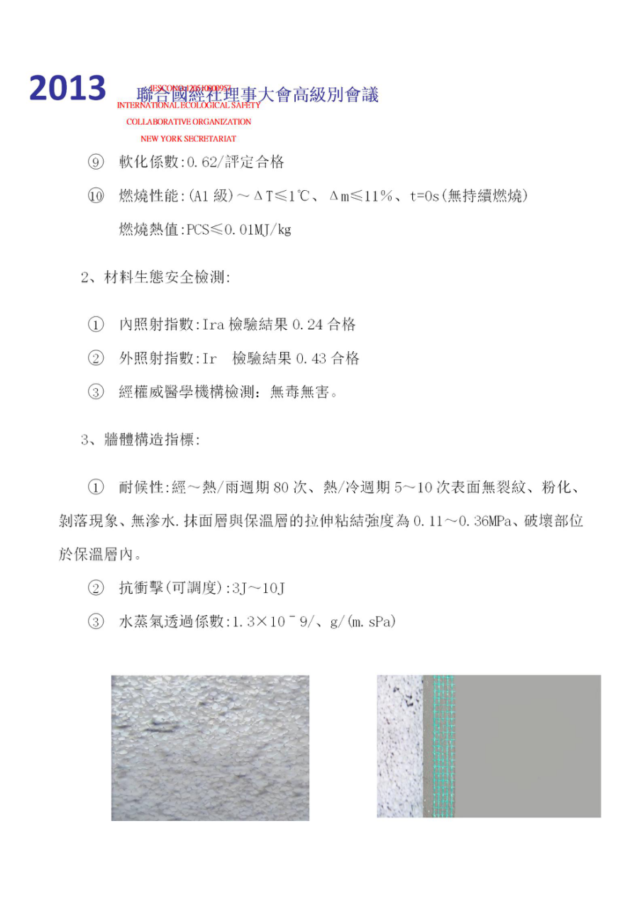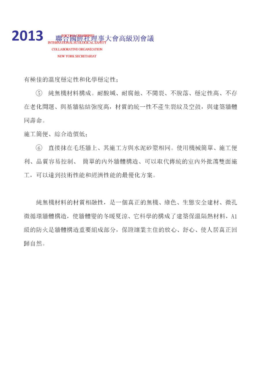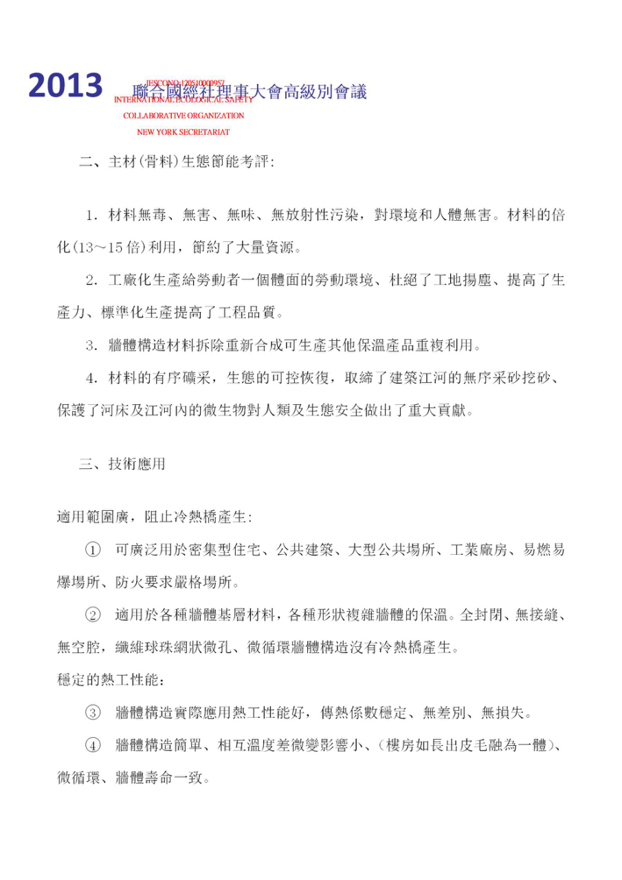 2013年4月參加聯(lián)合國人居署理事大會第24屆會議在內(nèi)羅畢召開——倡導(dǎo)并呼吁人居建筑生態(tài)安全。 同年7月聯(lián)合國經(jīng)社理事會高級別會議——《生態(tài)安全與科技創(chuàng)新專題會議》瑞士.日內(nèi)瓦,聯(lián)合國經(jīng)社理事大會高級別會議——產(chǎn)品獲人居建筑材料《生態(tài)安全與科學(xué)技術(shù)創(chuàng)新》鑒定。 同年9月參加2013歐亞經(jīng)濟論壇——中國.西安;再次倡導(dǎo)并呼吁人居建筑生態(tài)安全。