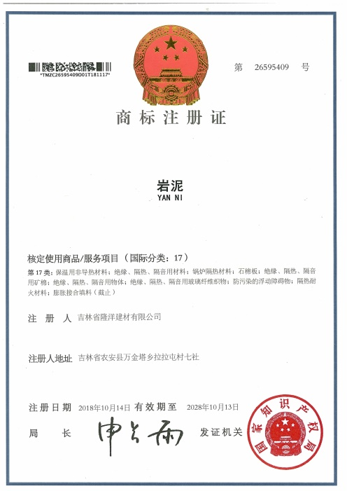 “巖泥”是吉林省隆洋建材有限公司生態(tài)安全與科技創(chuàng)新 “發(fā)明專利”;發(fā)明專利號:ZL 2017 1 0759564.7。