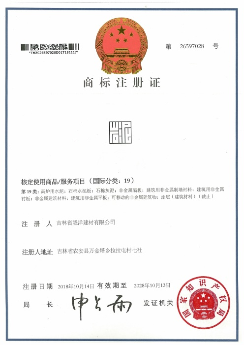 是吉林省隆洋建材有限公司生態(tài)安全與科技創(chuàng)新 “發(fā)明專利”;發(fā)明專利號:ZL 2017 1 0759585.9。