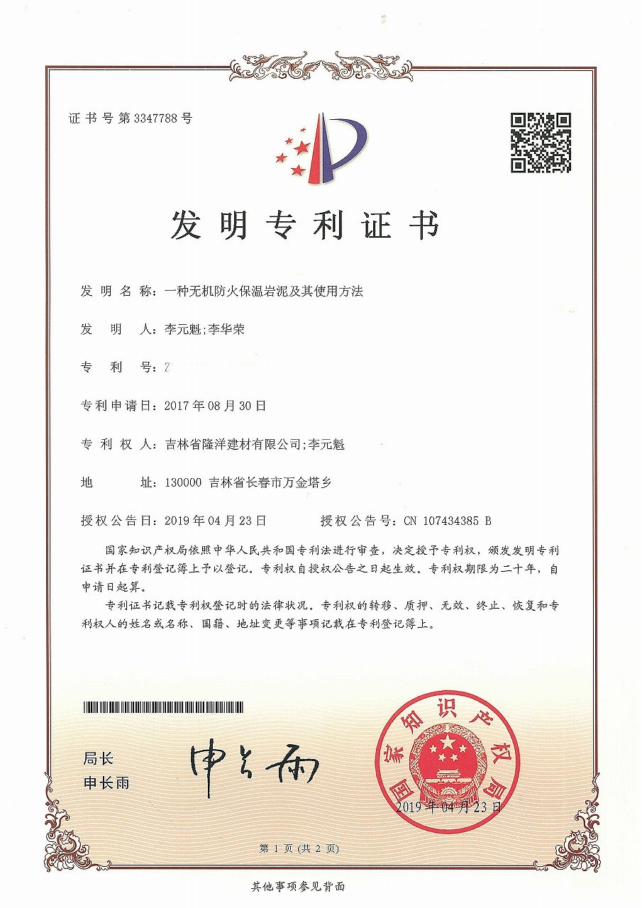 熱烈祝賀我公司獲得無機(jī)防火保溫巖泥及其使用方法發(fā)明專利證書